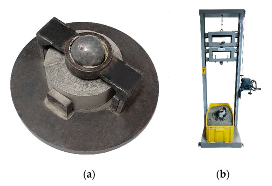 According to ACI 544-2R [39], the impact test of 150 mm × 64 mm CFRC specimens was carried out by impact equipment (SP-006, Sheng Peng, Yunlin, Taiwan). The impact energy was 25 J as the interval, and the number of repeated impacts was measured from 50 to 150 J. Figure 8a shows the impact specimen and impact device, and Figure 8b shows the impact test equipment.