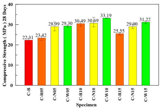 Table 6 shows the compressive strength of different CFRC and benchmark under different fiber weight proportions. Under three different carbon fiber weight proportions, the recycled carbon fiber-reinforced concrete and normal carbon fiber-reinforced concrete did not exhibit a greater enhancement effect on compressive strength than the carbon fiber-reinforced concrete by removing the coupling agent. For instance, the C-W10 specimen exhibited the highest compressive strength (33.19 MPa) compared with C-B specimen, C-N10 (30.69 MPa), and C-R10 (30.49 MPa), as shown in Table 6.
