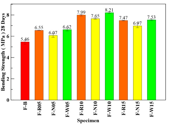 Average flexural strengths of CFRC and benchmark specimens. (Note: F—Flexural; B—Benchmark; R—Recycled carbon fiber; N—Normal carbon fiber; W—Carbon fiber without coupling agent).