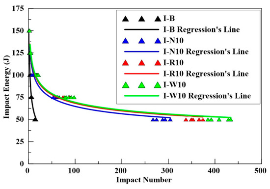 The impact numbers of benchmark and CFRC specimens under different impact energies are shown in Table 8. From the test results, the I-N10, I-R10, I-W10 specimens resisted repeated impact at low energy of 50 J and the average impact numbers were about 285, 356, and 410, respectively. Compared with the I-B specimen, the I-N10, I-R10, and I-W10 specimens and the impact number increase percentages were about 1828%, 2305% and, 2669%, respectively. From the impact test result, the CFRC specimens with recycled carbon fiber and carbon fiber without coupling agent exhibited enhancement effects compared to the CFRC specimen with normal carbon fiber.