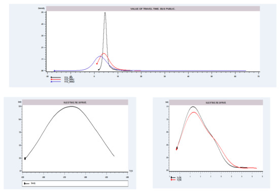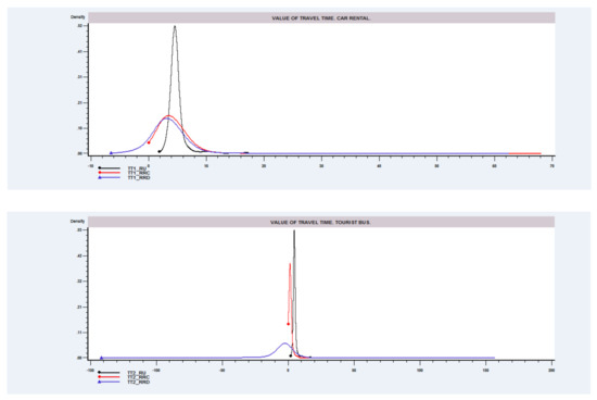 To better understand the meaning of the willingness to pay figures obtained using these three approaches, the distribution of the WTP is analysed through the kernel density estimates shown in Figure 1 and Figure 2. In the case of in-vehicle travel time (Figure 1) for the first three alternatives, the distribution of the Dekker measure (labelled as TTi_RRD) presents a significant proportion of individuals with negative WTP, this being higher for tourist bus users. The distribution of the value of time obtained for the RUM model (labelled as TTi_RU) has less dispersion than that obtained from the Chorus measure (labelled as TTi_RRC). In contrast, for private car users, the value of time distribution does not present negative values and the two approaches used for the hybrid model show similar results. As for the case of access and waiting time (Figure 2), the values of time distributions are substantially different, explaining differences obtained in aggregate measures presented in Table 6. In addition, individuals obtaining negative value of time (in the Dekker measure) suggest that even in the case of marginal reductions in travel time they could claim a monetary compensation to keep the expected maximum hybrid utility–regret function constant.