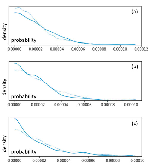 Posterior probabilities distribution for the leakage on the shipside (a), shoreside (b) and connection (c).