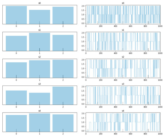 An example of the HMM sampling is shown in Figure 7, obtained by considering the intermediate hidden state. In the same Figure 7, s0-sn represent the simulated future time-steps, while the bar-charts on the left hand side represent the most probable expectations deriving from the inferential sampling shown on the right hand side (nr. of MCMC samples vs. state).