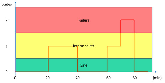 The probabilistic nature of the perturbations, and thus of their associated outcomes, requires a probabilistic scoring system for resilience. Additionally, the multitude of conceivable scenarios, each one with associated probability distribution, necessarily limits any scoring system to specific classes of representative perturbation, without prejudice to the possibility of inserting new ones derived from the system application in the field. The resilience of the whole system can thus be expressed as an indication of how likely the system is changing its state. Combining the most probable sequence of system states (Figure 8), with a Monte Carlo asynchronous sampling from the posterior predictive probability of failures (Figure 6), into the same HMM model, it is possible to represent the resilience score with a single parameter R varying between 1 (corresponding to safe system mode) and 0 (corresponding to failure system mode). The value of R can be continuously updated with the state evidence obtained by the previously mentioned random walks. Each step of the overall resilience score considers the CDF (Cumulative Distribution Function) of the different state probability.