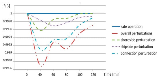 Figure 9 represents how the resilience score R is changing during the operation, when different perturbative situations appear. In this way, the approach would open the way for continuous monitoring of the resilience level and provide anticipated indications for when and where to adopt corrective actions. The last item is well connected to the correct implementation of effective planning and execution of emergency response, which is recognized as a key learning lesson from accidents in the process industries [45].