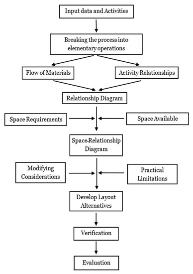 This is a procedure used to design a facility layout by considering the relationship between workplaces and placing the ones with a high frequency close together [32]. The Systematic Layout Planning is “an organized way to conduct layout planning. It consists of a framework of phases, a pattern of procedures, and a set of conventions for identifying, rating, and visualizing the elements and areas involved in planning a layout” [14]. The methodology, shown in Figure 1, is composed of 10 phases. For an explanation of this technique and details about the procedure, readers are suggested to refer to Systematic Layout Planning—4th edition [14].
