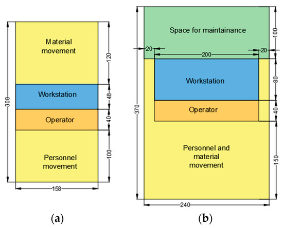 Space requirements can be calculated by following the methods described in the Muther procedure [14]. Some guidelines are provided here for reconfigurable workstations. A reconfigurable production system has an adjustable structure to enable workstation adaptability to a repeated change in production, as a response to the customer’s demand [38]. The adjustment is accomplished by changing manufacturing methods, material flows, and logistic functions over the mid-term [39]. This can be achieved by implementing workstations that can be reconfigured for the products to be assembled.