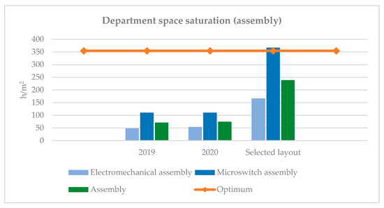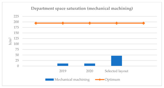 To assess the improvement achieved with the new layout, the present space saturation was compared with the expected values to check the amount of the improvement. The data reported in Table 6 for space saturation were compared for the assembly department in Figure 10 and for the mechanical machining department in Figure 11. The values of the assembly operation departments showed a great improvement as compared to the years 2019 and 2020. The increment of space saturation of the assembly department was 241.7%, compared to the year 2019, and 216.3%, compared to the year 2020. The microswitch assembly exceeded the optimum value, because workbenches were smaller than standard, but this was a particular situation, and the improvement was of 231.4% for both years. However, the electromechanical assembly, which requires standard dimension workbenches, achieved a good improvement. The division of the assembly department into dedicated areas reduced space saturation. Removing the dedicated areas and working on products of different customers in the same area, made reaching workstation saturation easier. The lack of demand from a customer could be compensated by the demand of another, thus reducing idle time. With the changes, the improvement obtained in this department was of 261.6%, compared to the year 2019, and of 203.7%, compared to the year 2020.