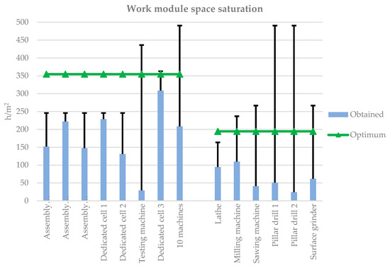 The mechanical machining department reached an improvement of 314% in space saturation. The gap between the optimum and the expected value was very large, because some resources were duplicated (sawing machines and lathe) and not fully exploited. Some equipment in the assembly department, such as the testing machine and pillar drill, were also undersaturated, as in Figure 12. A more specific demand for an operation or more customers requiring the use of the same equipment could partially overcome the problem, facilitating the saturation of the machines. Anyhow, it was difficult to accomplish because social cooperatives are subcontractors.