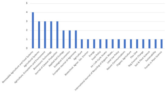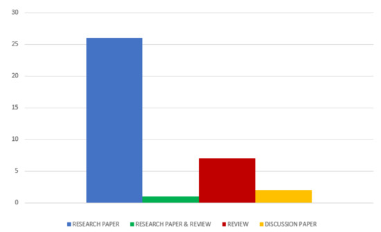 The highest concentrations of articles are Renewable Agriculture and Food Systems (four texts) and Journal of Cleaner Production, Bioresource Technology, Agriculture, Ecosystems, and Environment and Agricultural Systems, each with three studies. In relation to the categories of the research, most articles selected conducted empirical research methods (26), while seven were literature reviews, two were discussion papers, and one was a mix of empirical and review research, according to the graphic distribution depicted in Figure 3.