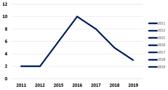The period of publication of the studies ranges from 2011 to 2019, and the interval with the highest number of academic productions was from 2016 to 2017 (18 of the 36 selected articles), as shown in Figure 4.
