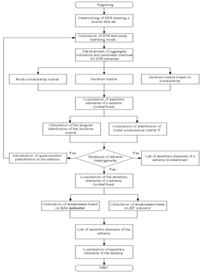 The presence and placement of sensors and weak points was determined using numerical and analytical methods for studying the scheme of the EPS and its parameters of singular analysis with the Jacobian matrix formulated in Equation (2) and the bus admittance matrix given in Equation (3):