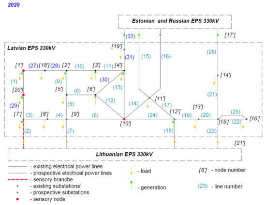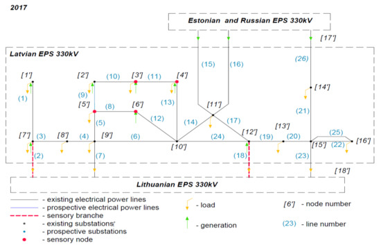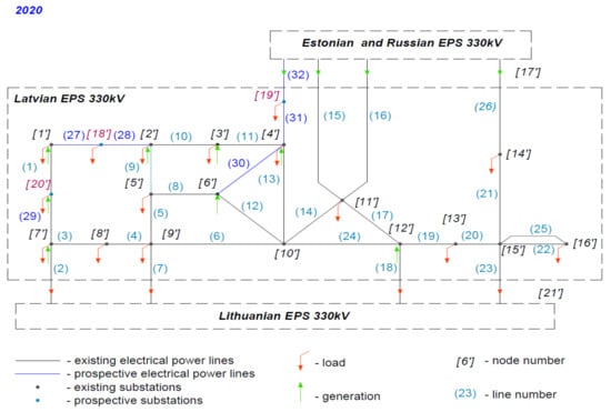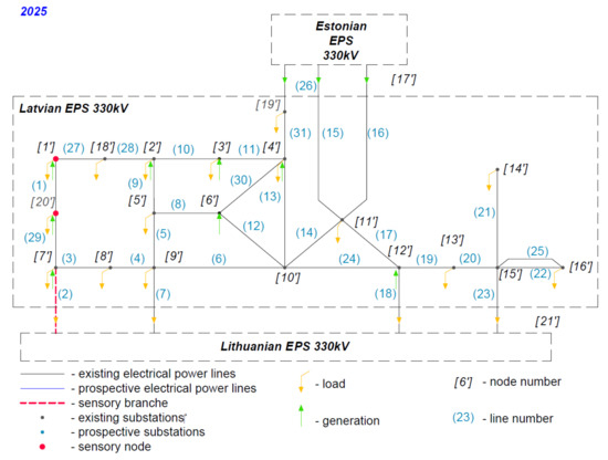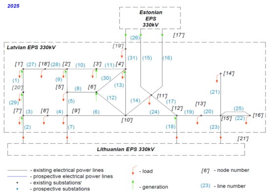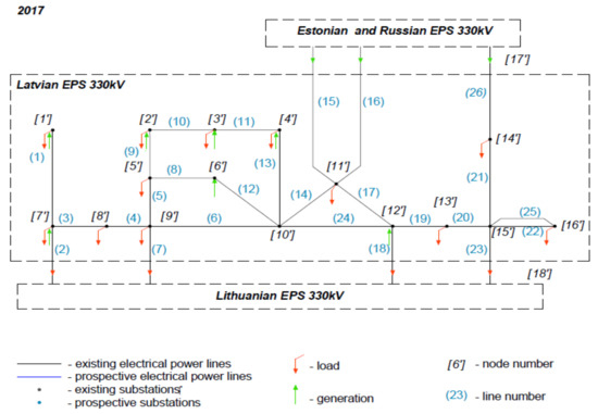 Research of the Latvian power system was carried out based on three model schemes obtained for the past mode (2017) presented in Figure 6, the current mode (2020), and the planned mode (2025) including development scenarios (Figure 7 and Figure 8) considering the share of the growth prospects of renewable power generating capacity and the disconnection of continental Europe from the BRELL. The Latvian power system has interconnection lines with Estonian, Lithuanian, and Russian networks and is a part of the Nord Pool Spot market. The transmission power system of Latvia operates in two voltage classes: 110 kV and 330 kV.