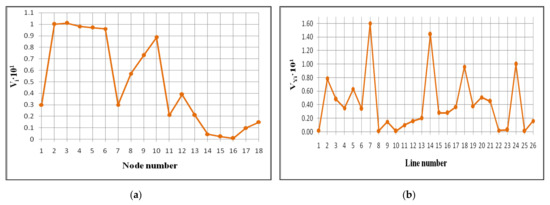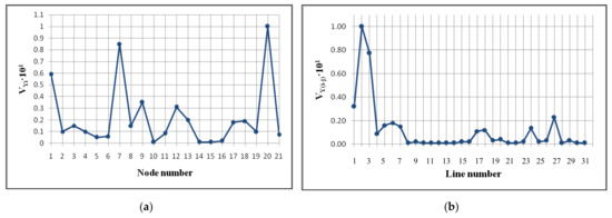 Computation results of branch sensitivity of the examined power network (2017) based on singular analysis of the Jacobian matrix: (a) node sensitivity for bus voltages; (b) branch sensitivity by voltage loss.