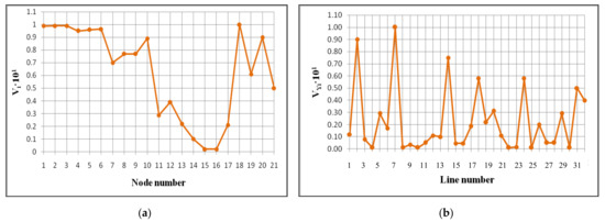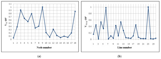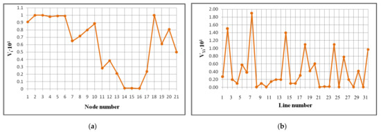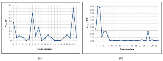 Using the methods of singular analysis of the Jacobian matrix and the bus admittance matrix, for the scheme shown in Figure 6 (2017), the maximal components of the right singular vector corresponding to the minimal singular value of the Jacobian matrix were identified as voltage sensing nodes 2′, 3′, 4′, 5′, 6′, 10′ (Figure 9a). Having sensitivity in terms of loss of voltage were branches 2, 7, 14, 18, 24, (Figure 9b).