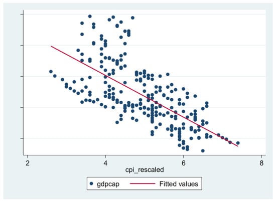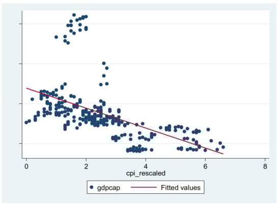 GDP/capita (euro/capita) and CPI rescaled scatterplot for the OMS sample. Source: authors’ processing using Stata software.
