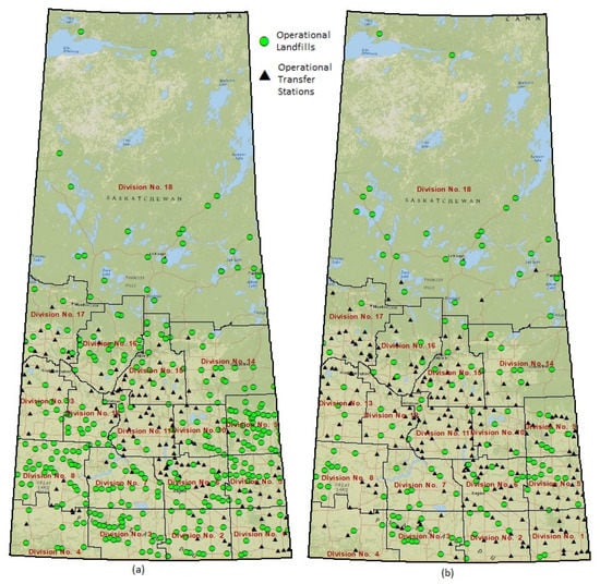 The spatial distributions of landfills and transfer stations in Saskatchewan in 2017 and 2020 are shown in Figure 1. A comparison between Figure 1a,b indicates a significant temporal change in the geographical spread of waste facilities across the province. The green circles represent operational landfills, and the black triangles represent operational transfer stations. Generally, there are many more waste facilities in Southern Saskatchewan, where major urban centers are located. Despite representing about 45% of the total area of the province, division 18 at the North contains very few waste facilities, predominantly due to its rural nature. It is important to note that there was no transfer station in Division 18 in 2017, as shown in Figure 1a.