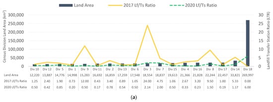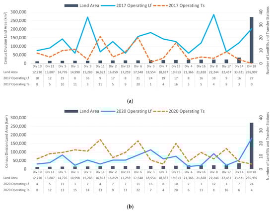The division land areas were plotted with the number of operational landfills and transfer stations, as shown in Figure 2. Division land areas were plotted ascending from left to right on the horizontal axis, ranging from 12,220 km2 (Division 10) to 269,997 km2 (Division 18). It appears that the number of the waste facilities in a division is not well correlated with the land area in either 2017 and 2020.