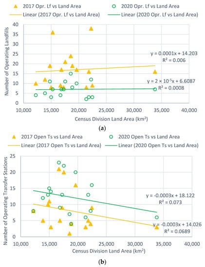 The relationship between operational landfills and transfer stations to division land area in (a) 2017, and (b) 2020.