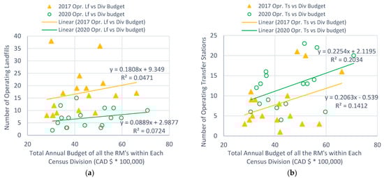 Regression analysis between the number of waste facilities and annual budget in 2017 and 2020: (a) all operation landfills, (b) all transfer stations. * Division 18 is excluded.