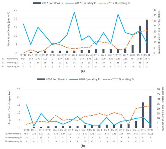 The relationship between operational landfills and transfer stations to population density of the division in (a) 2017, (b) 2020.