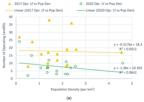 Regression analysis for (a) operation landfills; (b) transfer stations against population density in 2017 and 2020. Data from divisions 6 and 11 are excluded.