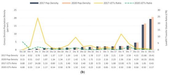 The LTRs are plotted with respect to census division land area (Figure 7a) and population distribution (Figure 7b). As shown in Figure 7a, the green broken curve is always below, or equal to, the orange solid line. On average, there was a 72% decrease in LTR during the study period across the province. Division 18 is an exception, since it had no operational transfer stations in 2017, and thus LTR was undefined (Equation (1)) and arbitrarily set to zero in Figure 7a. The LTRs in 2017 are quite erratic, ranging from 0.43 (Division 11) to 24.00 (Division 3). The LTRs in 2020 are more consistent among divisions (0.17–6.00), suggesting a province-wide movement of replacing landfills with transfer stations. The reduction in LTRs is however poorly related to division land area.
