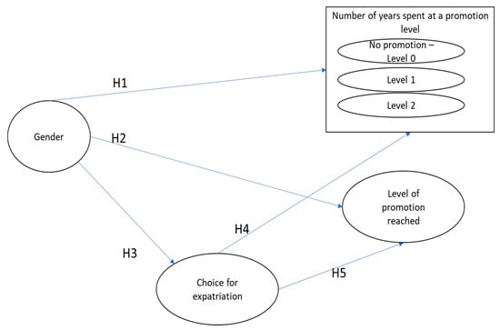 Since H3 was rejected (gender has no significant impact on the choice of expatriation), this means that there is no possibility of mediation [] by the expatriation choice variable on the relationship between gender and time at each of the levels or the level reached by graduates. Furthermore, since gender and expatriation have a significant impact on both the time spent at each level of the hierarchy and the level of hierarchy reached, it is interesting to consider which of the two variables has the greatest impact on the careers of graduates.