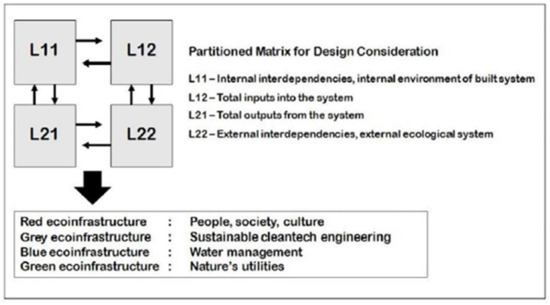 Guiding this paper, the theories applied include the Theory of Ecological Design and the Five Pillars of Economic Development. The Theory of Ecological Design was conceived in 1975 and formalized in a dissertation by Yeang, K.K. 1980 [5]. According to Franz, Sarkani, and Mazzuchi [6] and Franz, A. [7] the theory commenced the industry’s vigorous focus on sustainability, shifting the paradigm for standard practice, changing the future course of design and establishing sustainability as a new standard for success. As highlighted by Franz, Sarkani, and Mazzuchi [6,7], Yeang’s original model for internal interdependencies, total inputs, total outputs and external interdependencies was later enhanced by red, grey, blue and green ecoinfrastructures (Figure 2). The partitioned matrix for design consideration’s systems approach highlights the importance of energy efficient and environmentally sound architecture and the built environments’ connection of people, society and culture to nature and water. Whole system design aligning goals, vision, planning, design, construction, project and business management processes with outcomes enhances success, and was applied in this research’s methodology and results.