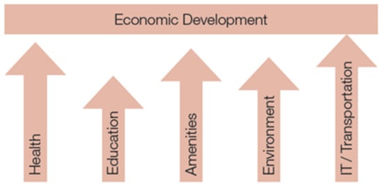 O’Hara [8,9] in the Five Pillars of Economic Development, a study of sustainable future for Ward 7 and 8 in Washington D.C., explains why some communities develop and others do not, what works in economic development of a community and if economic development can be influenced to make communities prosper. In this study, she criticized the base theory of economic development approach, which argues that a region’s economy will grow if the base sector thrives. She highlighted why this traditional model is problematic and offers a new model called the five pillars of economic development. Contrary to the traditional model, her model focuses on tracking and improving those factors that contribute to a high quality of life (QoL) of a community. The model focuses on lead indicators rather than the lag indicator for economic development proposed in the traditional economic development model approach. The five-pillar model proposes (1) health, (2) education, (3) environmental quality and recreation, (4) social and cultural amenities and (5) information and transportation access as the key indicators that can measure the community’s likelihood of long-term economic success (Figure 3).