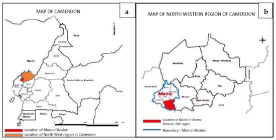 (a) Location of NW region in Cameroon; (b) Location of Batibo in Momo Division, NW region of Cameroon.
