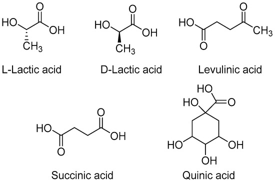 Lactic acid (LA) is the simplest hydroxyl acid with an asymmetric carbon atom and two optically active configurations, namely the L and D isomers (Figure 2). LA is a well-established bio-based chemical and its global annual production amounts to approximately 270 kilo tons per year [39]. It finds applications in several sectors ranging from the food industry to cosmetics and pharmaceuticals, and it is also employed for the synthesis of PLA, which is by far the most commercially developed bio-based plastic that is mainly applied in packaging and in pharmaceutical industries. LA can be produced through a petrochemical route or biotechnologically by exploiting renewable feedstocks, mainly corn [40], but also food wastes and by-product streams [41,42,43]. Currently, the industrial production of LA is mostly carried out by microbial fermentation of carbohydrates, since higher purity products can be obtained. The majority of the fermentation processes use species of Lactobacilli, which give high yields of LA. Some organisms predominantly produce the L isomer, such as Lactobacilli amylophilus, L. bavaricus, L. casei and L. maltaromicus, whereas L. delbrueckii, L. jensenii or L. acidophilus produce the D isomer or a mixture of L and D [44].