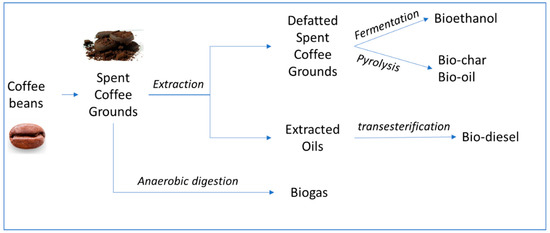 - Haile, M. Integrated valorization of spent coffee grounds to biofuels. Biofuel Res. J. 2014, 1, 65–69. [Google Scholar] [CrossRef]