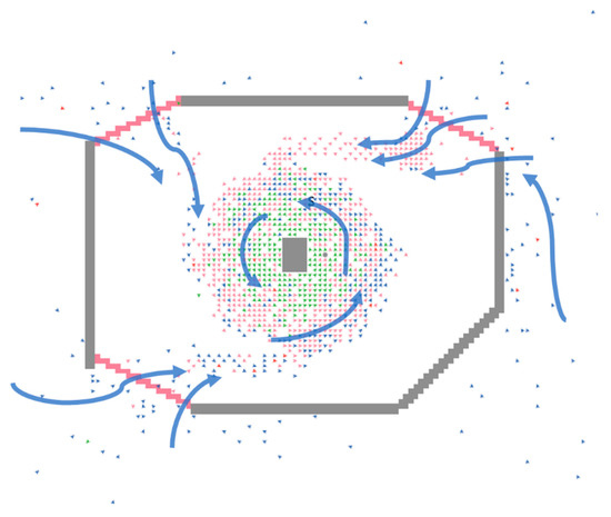 In Ramy al-Jamarat, the agents start at a random location before the first pillar. The crowd behavior is such that the agents move towards each pillar in sequence and congregate around it as each agent aims to move closer, so as to be in range of throwing a pebble. It takes an agent four simulation steps, or ticks, to successfully throw a single pebble. Once an agent has thrown seven pebbles, they move on to the next pillar until all three pillars have been visited. The agent only attempts to throw a pebble when they are within a defined range of the pillar, and is always successful; here, we defined this range as a radius of four squares. The agents that have completed the ritual move towards the exit and are then removed from the simulation at their current position. This behavior is captured in Figure 4.