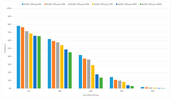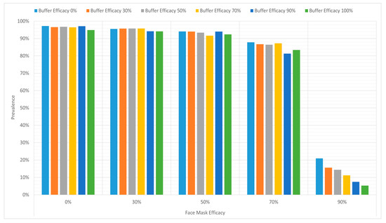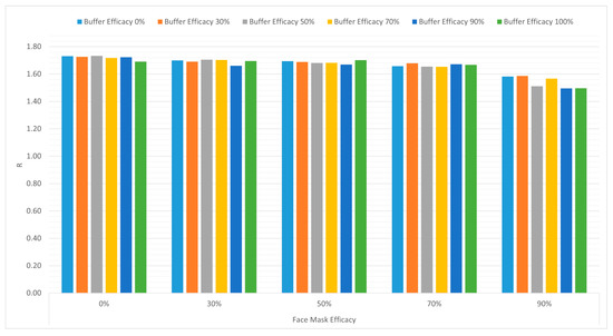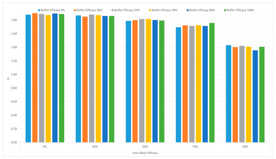 The results of these experiments show that a high-efficacy mask (>90% efficacy) is required to curb the spread of infection during the Tawaf. Low-efficacy masks had little effect. Moreover, the face mask was a more efficient control measure than the buffers. The results also show that effective buffers require an effective facemask, as shown in Figure 5.