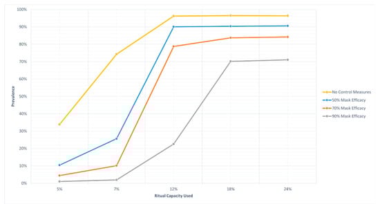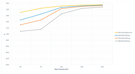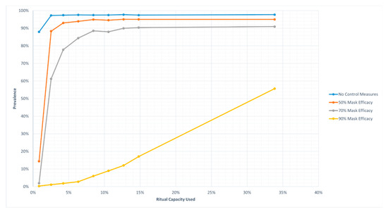 Along with control measures such as face masks and entry buffers, crowd control measures have also been a measure widely adopted by policymakers to curb the spread of COVID-19 within places of mass gathering. To help assist the policymakers in inferring the effect of crowd control measures on the spread of the virus, we studied the effect of limiting the total capacity used on the prevalence and infected reproduction number of the disease. In this sense, we introduced crowd control by limiting the total number of agents performing the ritual at the same time. This means that once the maximum allowed capacity of agents performing the ritual simultaneously is reached, no new agent can be introduced until an existing agent has left the ritual. For these experiments, we set the buffer efficacy to 100% and instead focused on varying the face mask efficacy. This was performed because the face mask was found to be the primary control measure in Section 3.1.1 and Section 3.1.2.
