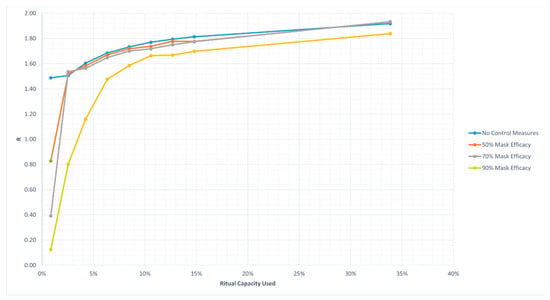 Effect of coupling ritual crowd control and control measures on the infected reproduction number of COVID-19 in Ramy al-Jamarat. Crowd control in this context limits the maximum number of agents performing the ritual at the same time.