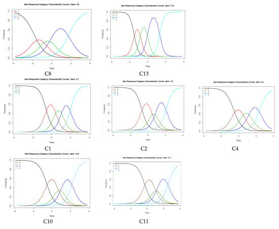 As can be seen from Figure 2 and Table 2, items with higher discrimination have more information, or area under the curve. For instance, for the first factor, C13 had a discrimination value of 4 versus 1.69 for C8, having a larger pick in the figure. The same explanation could be made regarding other figures.