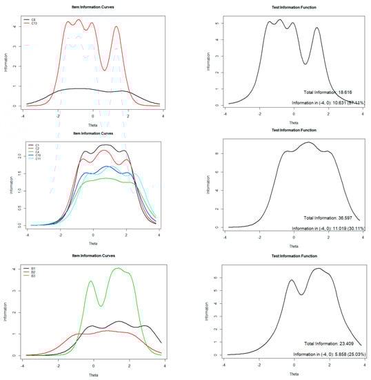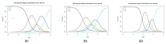 From the figures, using item B3 as an example, it can be noted that the amount of information has its maximum at an ability level of around 1.5 and is about 3 for the ability range of . Within this range, ability was estimated with some precision. However, outside this range, the amount of information decreases rapidly, and the corresponding ability levels were not projected very well.
