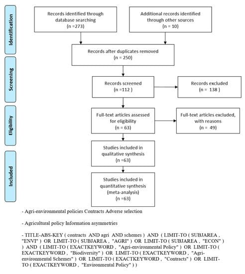 The first selection was conducted using the keywords “Agri-environmental policies”, “Contracts” and “Adverse selection” for the title, abstract and keywords with a global approach without field restriction. This first general round of research made easy to find the best string of keywords and to avoid the exclusion of relevant articles [43]. In the second selection, we utilised a strict string of keywords involving words such as “Contract”, “Agri” and “Schemes”. This procedure allowed us to better frame the context of the debate about contracts and its impact on the environment.