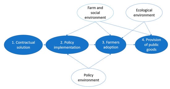 The process of providing AECPGs is quite long and complex. Figure 2 shows how policy, farms and social and ecological environment can influence the different phases of the implementation process of contract solution through policy measures.