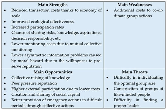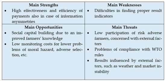 In this section, we propose a comparative analysis of the main features of action-based, result-based and collective action contracts [70]. To each contract type is dedicated a sub-section where also based on the above analysis about causes of policy failure and how they can be faced and overcome, we present a SWOT analysis of action-based contracts (Figure 4), result-based contracts (Figure 5) and collective contracts (Figure 6).