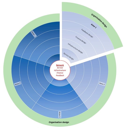 The design process should start with the network at the centre. First, the service design of the network is defined. Subsequently, the actors discuss their service design in relation to the service design of the network, in order to determine how the individual actor’s value proposition contributes to the network’s value proposition. The third, fourth, and fifth steps consist of simultaneously defining the network’s and distinct actors’ infrastructure, finance and feedback design respectively. While going through these phases, the organisation design of the network is specified, explicating the roles of and relations between the actors, with the aim of establishing a governance form for the network in which every actor knows its role and responsibilities.