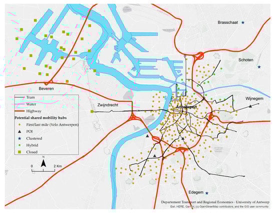 Antwerp is the most congested city in Flanders [46] and experiences mobility related problems. In order to tackle some of the challenges this poses, the city government has decided to look for alternative ways of transportation, such as shared vehicles, for its citizens. In 2011, it started its public station-based bikesharing program called Velo within the city center. The system has already been expanded to the surrounding municipalities. Moreover, the city has allowed and supported, through its market enabling platform called Smart Ways to Antwerp, different private shared mobility providers to operate within the Antwerp city region [47]. In total, nine shared mobility service providers, focused on the B2C market, are active in Antwerp and its surrounding municipalities. This mature shared mobility environment and the recognized approach of the city government to regulate shared mobility services [48], makes the city of Antwerp an appropriate case to hypothetically explore how a network of shared mobility hubs can be implemented and showcase the potential contribution of the different business models. Figure 2 indicates where the shared mobility hubs from the different business models should be located for the case of Antwerp.