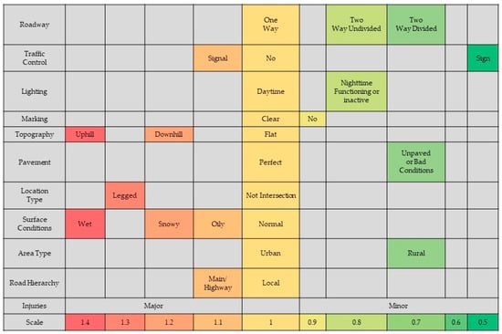 Considering base conditions (one-way, with no traffic control, daytime, with clear marking, perfect pavement, flat sections, no intersection, urban area, local road, and dry surfaces), P is equal to 40.5%. The share of major injuries is 32% in the data set. This is a positive indicator of the reliability of the model. However, the probability of risk reaches 68.8% in extreme conditions (one-way, traffic signal, daytime, uphill, perfect pavement, legged intersection, urban area, highway road, and wet road surface).