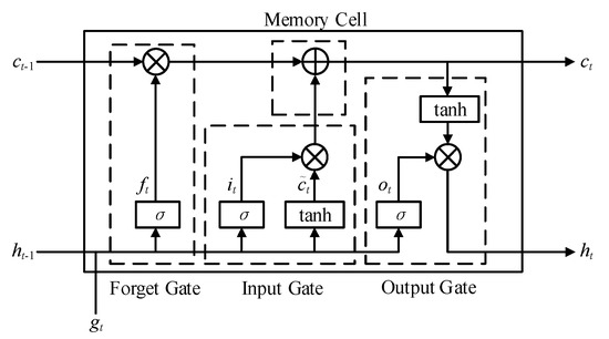 LSTM network, which is an excellent variant of recurrent neural network, has been widely used for TSA [8,16,17]. Its special memory structure can effectively solve vanishing and exploding gradient problem in the training process of long sequence data, and capture long-term dependent information in time series data. LSTM unit adopts a gating mechanism to control the transmission path of information. As shown in Figure 1, LSTM unit consists of a memory cell, a forget gate, an input gate and an output gate. The forget gate determines what information needs to be forgotten from the memory cell. The input gate controls the impact of the output at the previous moment and the input data at the current moment on the input of the memory cell. The output gate controls how much information the internal state of the current moment needs to be output to the outside status.