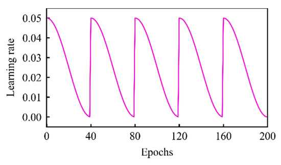 where j is the iteration times, is the initial learning rate, J is the total number of iterations during training, C is the cosine annealing cycles. In order to visually show the change curve of the learning rate with cosine annealing, set , , and , and the learning rate schedule is shown in Figure 2.