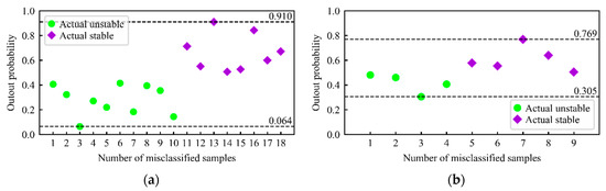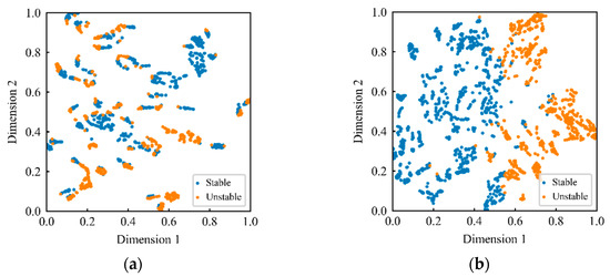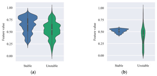 If the distribution of a feature in two different classes is similar, the correlation between the feature and the predicted target variable is weak. It can be seen from Figure 3a that the data distributions in stable and unstable conditions are highly similar. It can be seen from Figure 3a that the data distributions under stable and unstable conditions are highly similar, indicating that the feature has a weak correlation with transient stability in the early stage after fault clearance. In contrast, Figure 3b shows the distributions of data in two different conditions at the 50th cycle after fault clearance. The comparison shows that the electrical features have strong time-varying characteristics, and as time goes by, the correlation between the features and the transient stability of the system will become stronger. Therefore, in the hierarchical assessment process, the reliability of the prediction results output by the ensemble LSTM classifier is improved step by step. Similar to the confidence index proposed by [11], this paper defines the credibility index R to measure the reliability of the prediction results, and its expression is