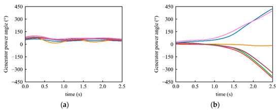 Post-disturbance dynamic response curves of generator power angles corresponding to different stability status: (a) transient stable; (b) transient unstable.