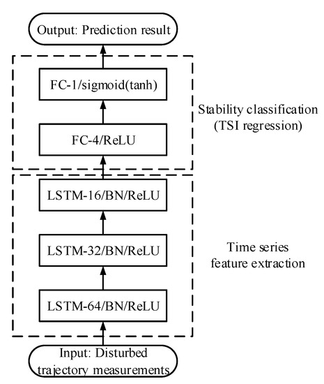The first part of the model consists of 3 LSTM layers, and the number of neurons decreases layer by layer, which can realize the progressive extraction of abstract high-order features from the input time series data. After the time series passes through three LSTM layers, the feature data points are reduced from to 16. The latter part of the model is composed of two FC layers, which can establish a complex nonlinear mapping between advanced features and the classes or margins of power system transient stability.